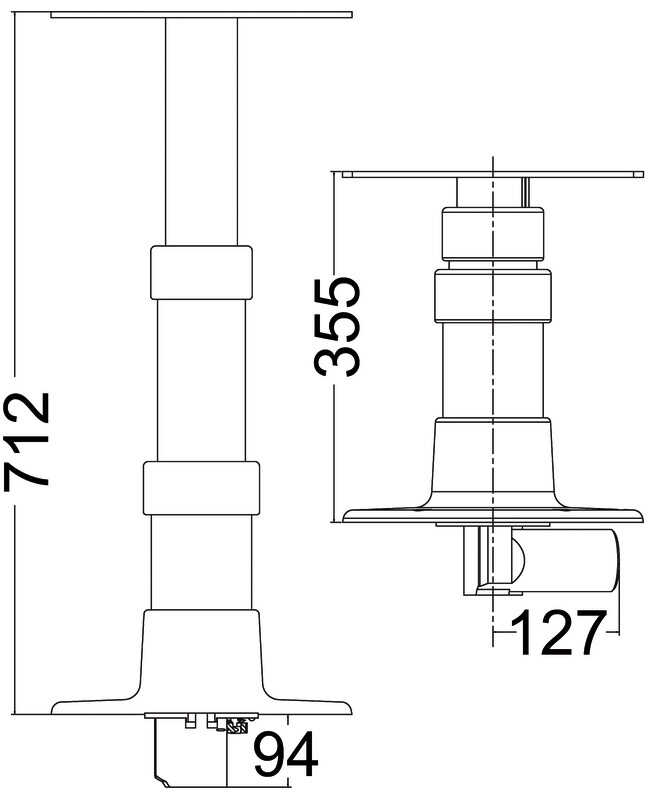 Die Osculati GIANT Tischstütze besteht aus hochglanzpoliertem eloxiertem Aluminium. Ihr Befestigungslager besteht aus Edelstahl und ist daher sehr stabil und robust. Es ist kein Durchbohren des Bodens nötig, um diese Osculati GIANT Tischstütze herunterzufahren. Lediglich Platz für den Motor ist notwendig (Siehe Zeichnung). Die Basis der Osculati GIANT Tischstütze hat einen Durchmesser von 305 mm. Ihr Rohr hat die Maße 100/88/72mm (Länge x Außendurchmesser x Innendurchmesser). Die Tischhalterung der Osculati GIANT Tischstütze ist 305x305mm groß.