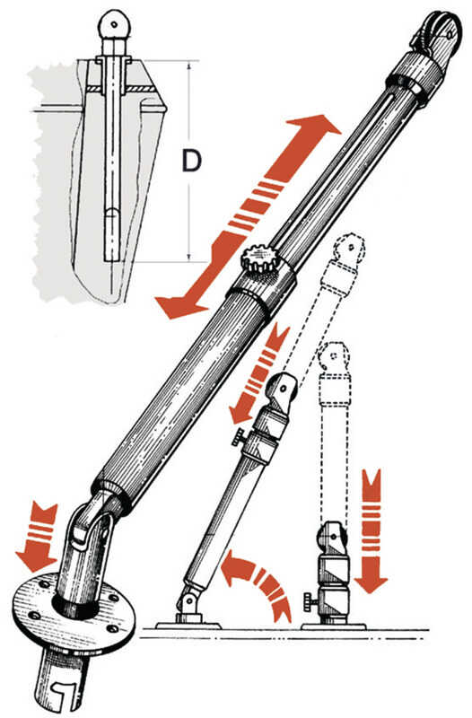 Zwei Arbeitspositionen: in Achse zum Boot (hängendes Beiboot) oder um 20° nach innen geneigt (hängende Gangway). Das Ausziehteil kann in verschiedene Positionen eingestellt werden. Dies gestattet eine optimale auf die jeweilige Beibootbreite angepasste Längenregulierung.